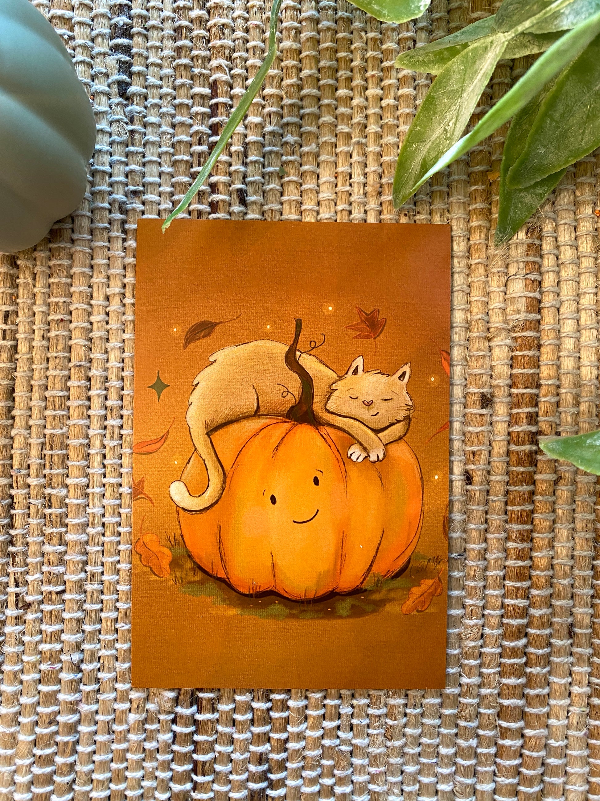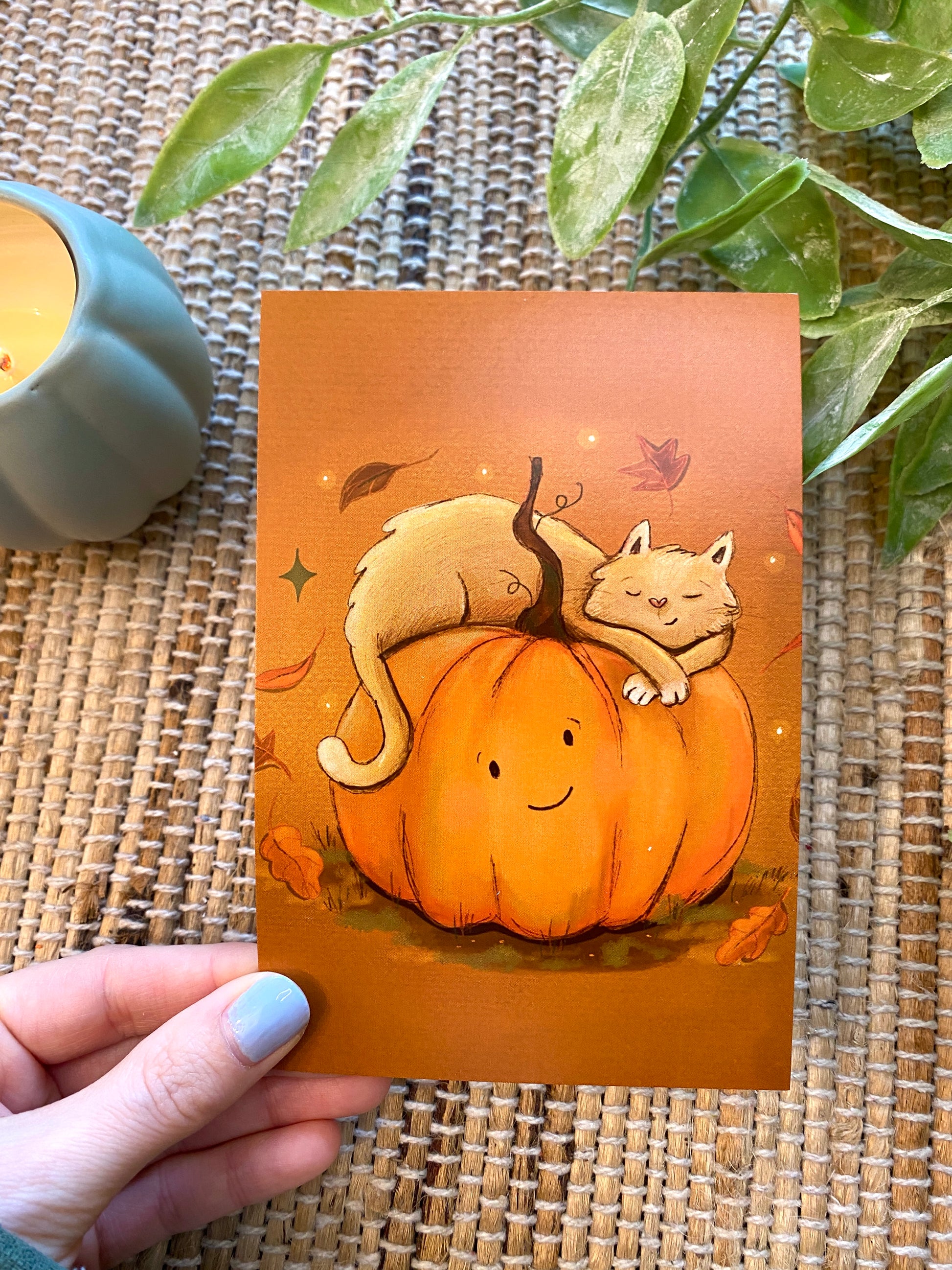 Send warm and fuzzy wishes with our cat snuggling a pumpkin card! 🐱 Perfect for spreading autumn cuddles and smiles. Share the love this fall!" 🎃