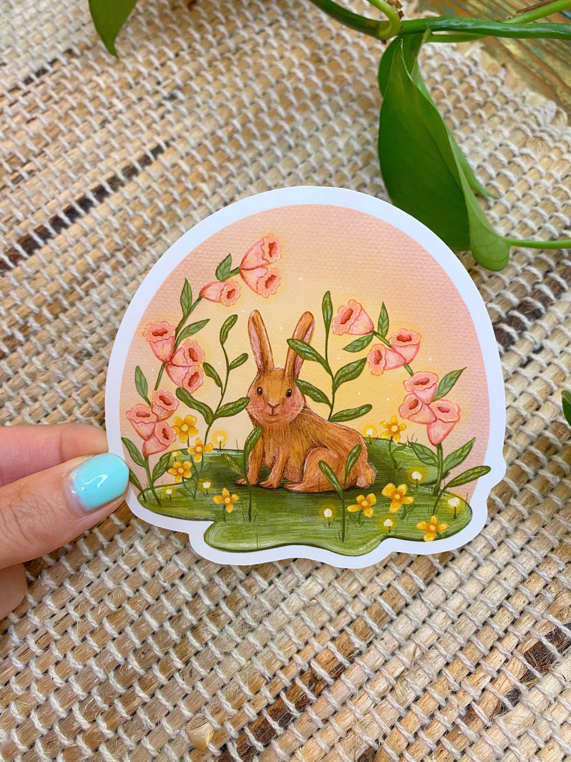 The cutest little bunny sitting in a flower patch. An original illustration on a vinyl sticker- perfect for water bottles, laptops and more!
