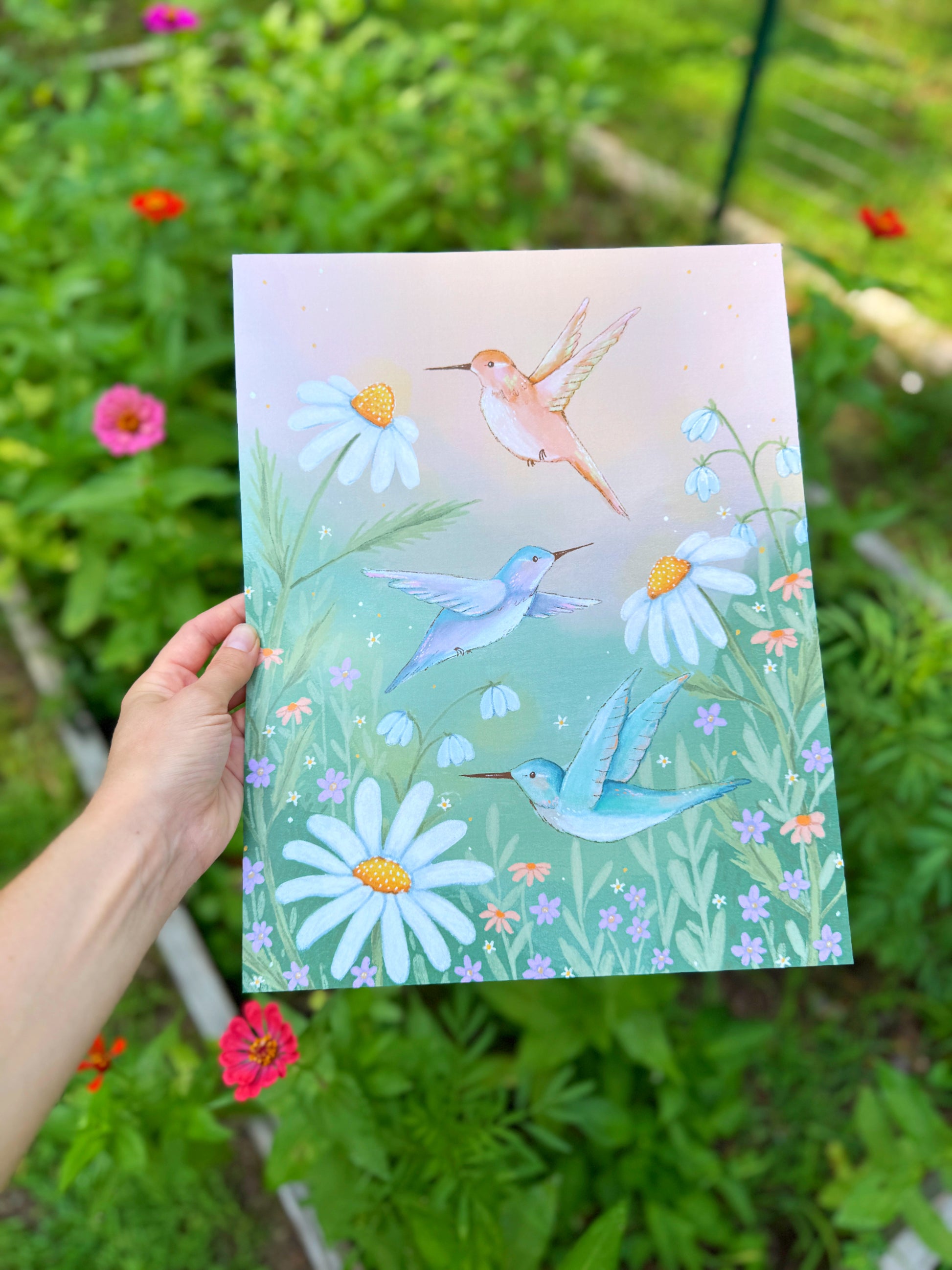 An original illustration printed at an 11x14 size ready to be framed! Hummingbirds in the Garden.