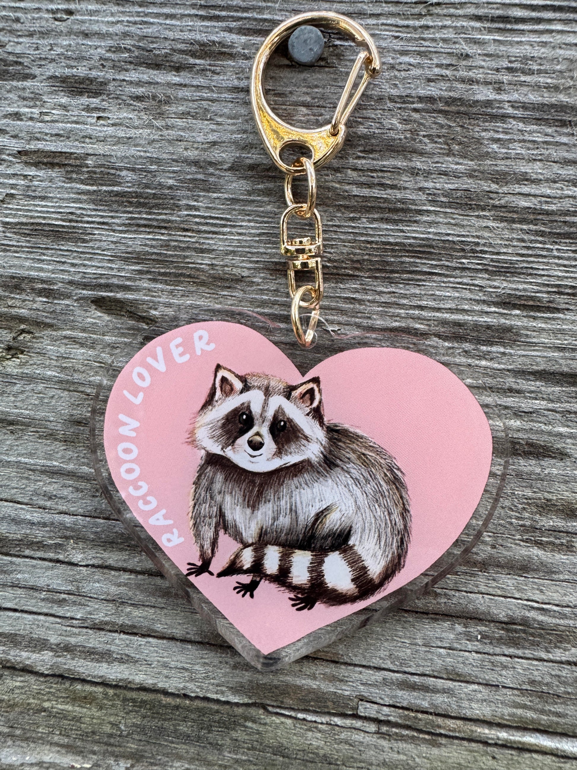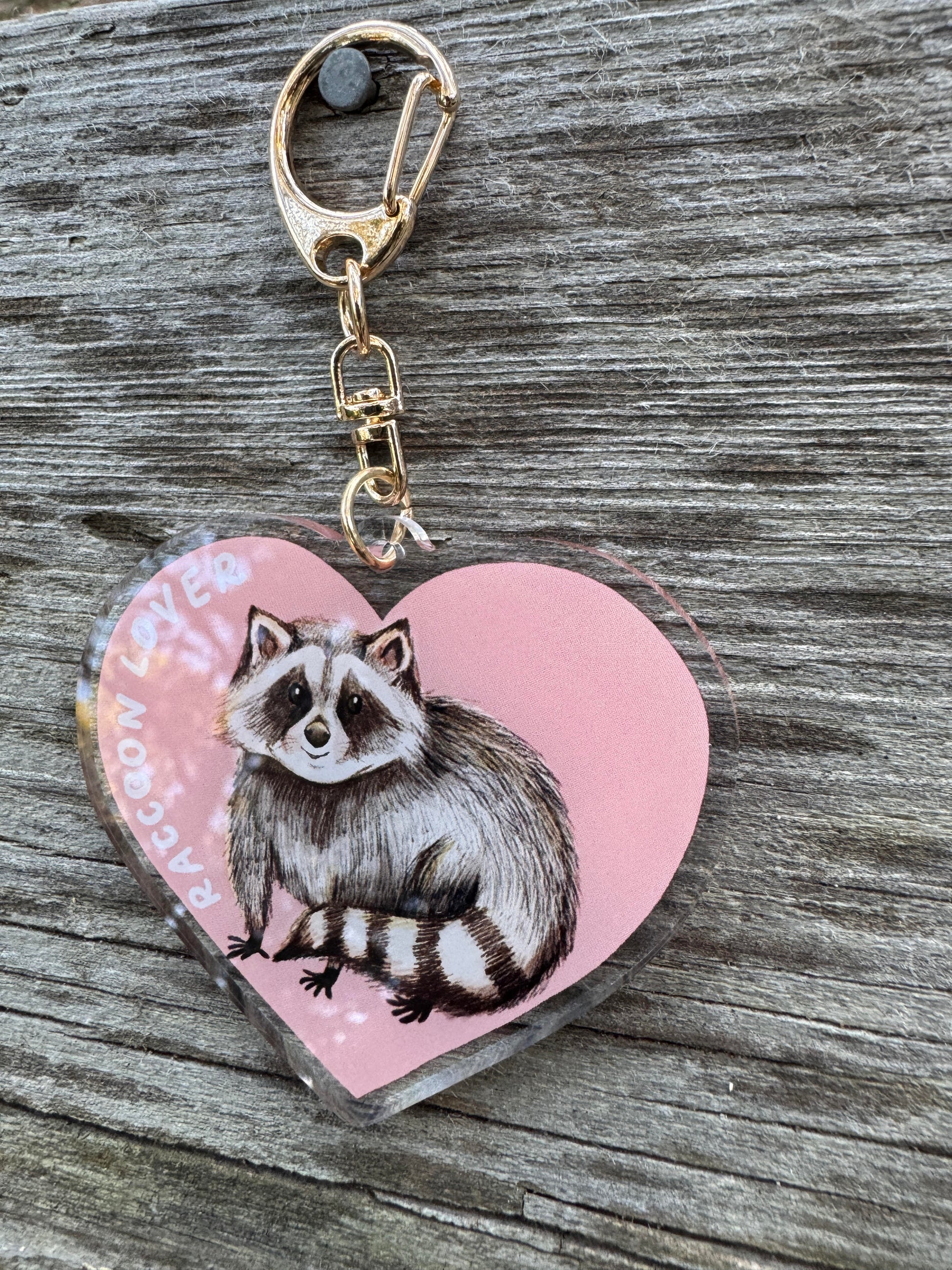 Raccoon Lover Keychain- an original illustration printed on an 2in x 2.5in acrylic keychain!