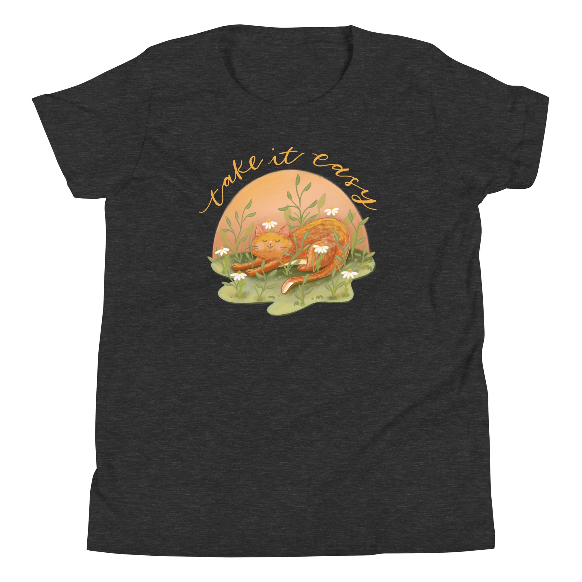 Take it easy cat stretching in the sun! Youth Sizing. An original illustration printed on a super soft tee!